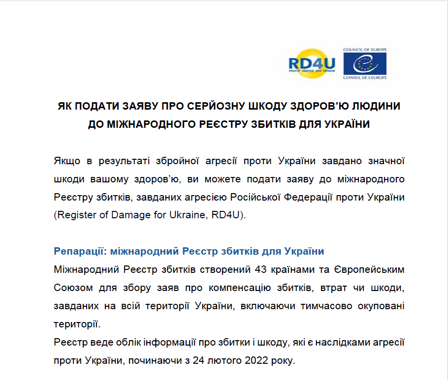 ЯК ПОДАТИ ЗАЯВУ ПРО СЕРЙОЗНУ ШКОДУ ЗДОРОВ’Ю ЛЮДИНИ ДО МІЖНАРОДНОГО РЕЄСТРУ ЗБИТКІВ ДЛЯ УКРАЇНИ 01.10.2025 0 Comments Інформація щодо міжнародного реєстру збитків Read More